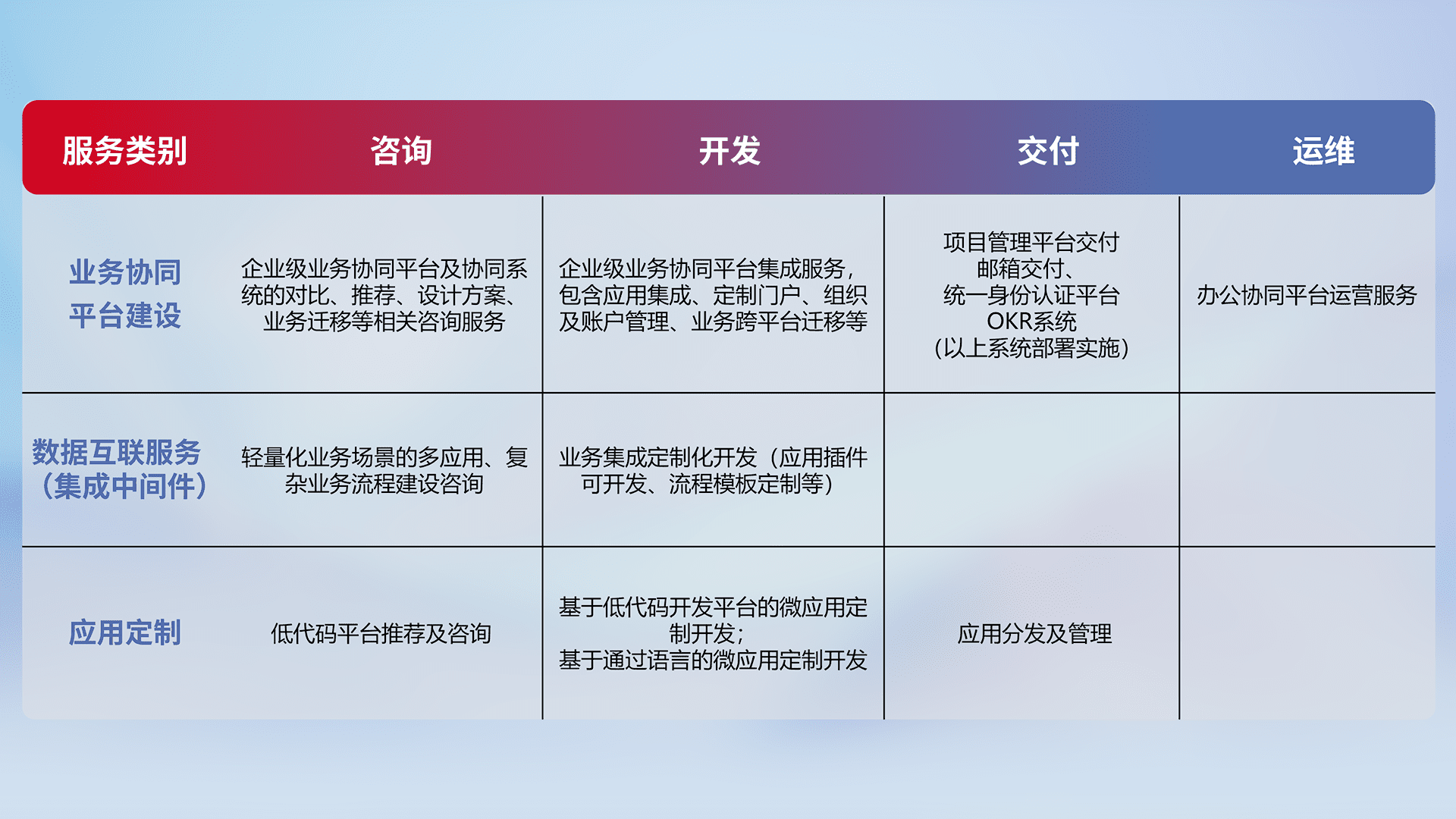 针对钉钉、、企微、、、IDaas等平台级产品提供产品的规划、、、、方案、、、交付、、定制化开发等服务,,,实现如统一协同办公、、智能客户服务、、混合会议管理、、智能数据查询、、、、等业务场景,,实现数字化转型。。。